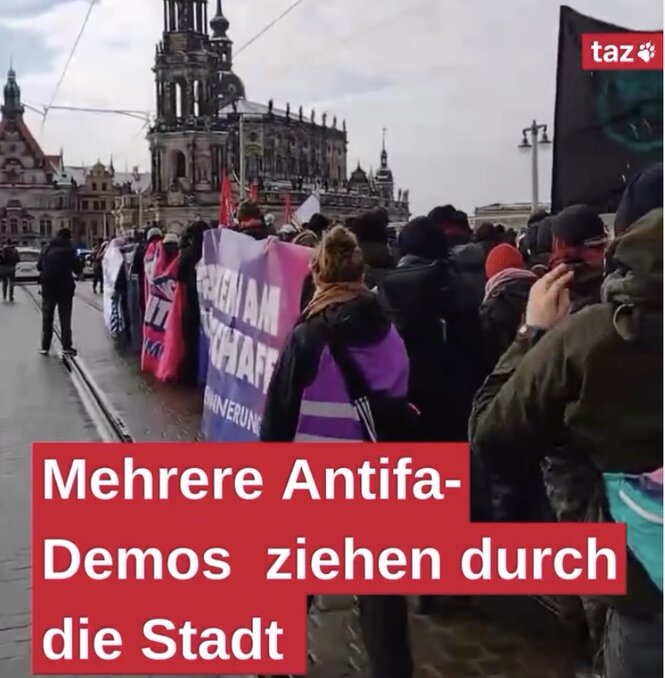 Schon um halb elf waberten Bässe über die Elbe in die Altstadt. Zwei Stunden, bevor sich die Neonazis versammelten, demonstrierten bereits mehrere hundert Menschen auf der Augustusbrücke. „Gegen den deutschen Opfermythos“, hieß es auf einem Banner. „Kampf dem Faschismus“, auf einem anderen. Die ersten Reihen des Demozugs skandierten „Es gibt kein Recht auf Nazipropaganda“ und „Nie wieder Deutschland, nie wieder Dresden“. Auf der anderen Seite der Altstadt zog ein zweiter, ähnlicher Protest in Richtung des Versammlungsorts der Neonazis. Über Stunden blieben die Demonstrant:innen in der Innenstadt.
