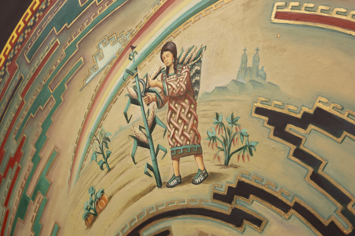 Da gibt es durchaus die Dokumentationen zu und Arbeiten von indigenen Gruppen – etwa die handgemalten Kalenderbilder der peruanischen NGO Waman Wasi mit Darstellungen von Agrargemeinschaften aus dem Amazonasgebiet. Zu sehen gibt es aber auch im europäischen Mittelalter spielende Szenen aus einem Computerspiel mit Frauen bei der Feldarbeit.