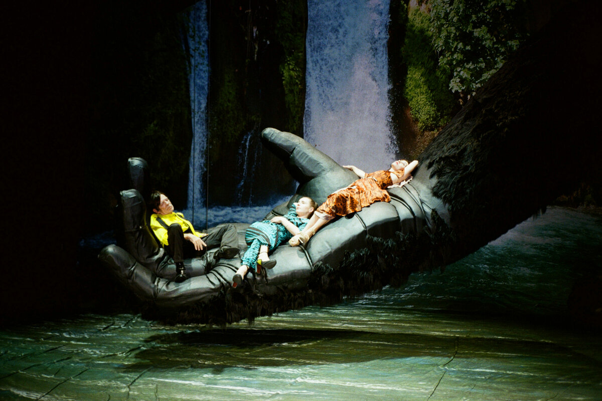 Martin Wuttke sucht die richtige Schlafstellung. Erst rollt er sich auf der King-Kong-Riesenhandfläche wie ein Embryo zusammen, klettert dann Richtung Daumen und klemmt sich am Schluss wie ein Brett zwischen Daumen und Zeigefinger. Seine Arme gehorchen der Schwerkraft und hängen sackartig-schwer nach unten. Wuttke ruht aus vom Leben mit den ewigen zwei Möglichkeiten. Er schöpft kurz Kraft für das weitere Philosophieren über den Knacks, den Sprung, den ein Leben bekommen kann.