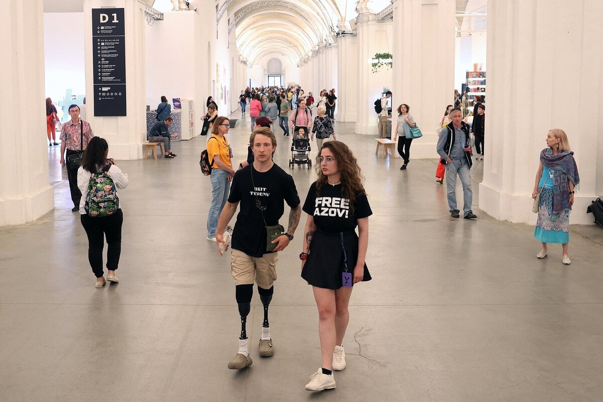 Militär und Polizei stehen vor dem prächtigen klassizistischen Gebäude gegenüber dem golden glänzenden Kyjiwer Höhlenkloster, es gibt Security-Checks mit Detektoren an vier Eingängen, lange Schlangen. Drinnen stellen unter den steinernen Gewölbebogen über 100 Verlage aus, die meisten sind ukrainisch. Ausstellungen, Konzerte, Panels, Filme sind Teil des Programms. Am Samstag und Sonntag sind die Reihen dicht gedrängt, die Hallen sind voll, 30.000 Besucher:innen kommen insgesamt. Festivalnormalität.