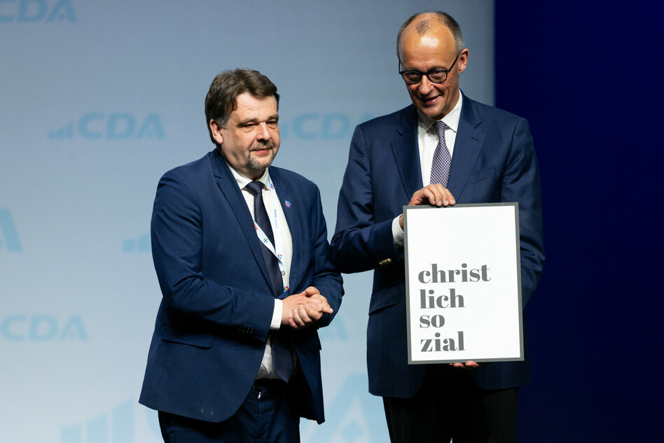 Der Delegierte aus Duisburg klatscht während Merz’ Rede kaum. Er sagt später, das liegt vielleicht auch an seiner Verletzung und zeigt auf die Bandage an der rechten Hand. Nur selten klopft er mit der gesunden Hand auf den Tisch. Zum Beispiel, wenn Merz sich auf Konrad Adenauer beruft und sagt „Die Wirtschaft soll den Menschen dienen, nicht die Menschen der Wirtschaft“. Oder als Merz verkündet, der AfD „werden wir nicht die Verantwortung für Deutschland anvertrauen“. Ein anderer Delegierter wird später auf der Bühne sagen: „Die Worte haben gutgetan“. Als der Saal aufsteht, um Merz zu verabschieden, bleibt der Delegierte aus Duisburg sitzen. Die Rede sei etwas zu wenig auf die Menschen fokussiert, findet er. Ein bisschen mehr zu den Themen Pflege und Wohnen hätte er sich gewünscht, schließlich hätte die Union auch dort etwas zu bieten.