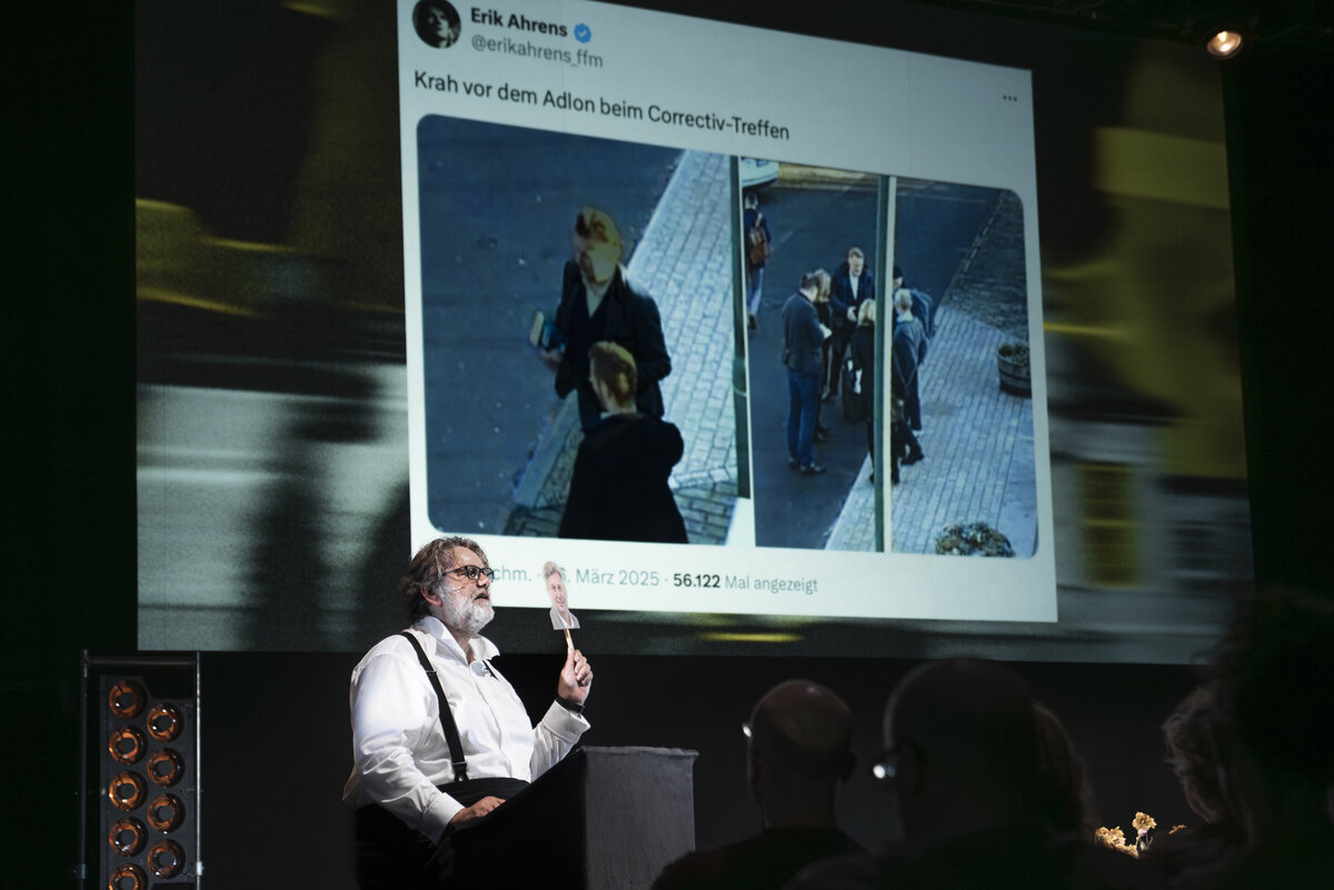 Einziges Problem: Es gab keinen direkten Zeugen des Potsdamer Treffens. Correctiv hatte zwar damals den Journalisten und Performer Jean Peters eingeschleust, der mit falschem Bart im Nebentrakt der Villa Adlon logierte und per Handykamera die Einladungslisten fotografierte. Doch den Wortverlauf des Treffens konnte er nicht aufzeichnen.