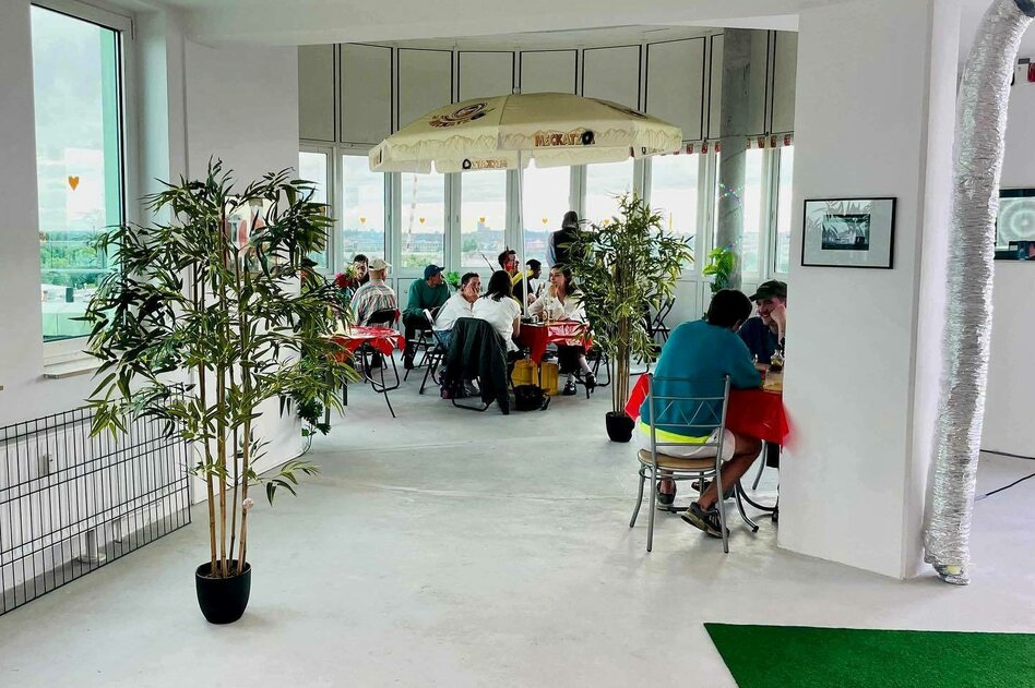 In den Aufzug steigen lohnt sich: Panoramaausblick, charmantes Turmzimmer und richtig viel Platz. Obwohl das Aktionshaus alles andere als ein Penthouse ist, hat der Raum auf den ersten Blick etwas Luxuriöses. Von drückender White-Cube-Stille jedoch keine Spur – dafür sorgen wild bepflanzte Blumenkästen auf dem Balkon, ein getigertes Retro-Rundsofa in der Ecke und der Duft von frisch gegrilltem Gemüse und Sauerteigbrot, der hier an einem Frühsommertag vom Balkon aus in den Raum schwebt.