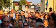 Wahlkampfveranstaltung mit einem Plakat von Sahra Wagenknecht.