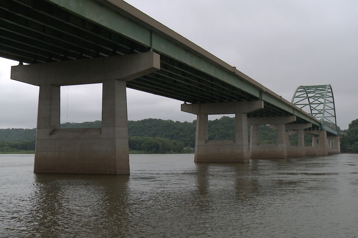 Sechs massive Betonpfeiler ragen aus einer graugrünbraunen Wasseroberfläche und verjüngen sich in einer schmaler werdenden Reihe im Fluchtpunkt des Bildes. Das hintere Ende wird von einem filigranen Stahlbogen überspannt, im selben Industriegrün gehalten wie die gerillte Unterseite der Fahrbahn. Eine Brücke, gefilmt von schräg unten. Die Autos, die sich darüber bewegen, kann man nur erahnen. Hin und wieder durchfliegen Vögel das Bild, einmal quert ein Boot. Sonst bewegt sich nichts. Gar nichts.
