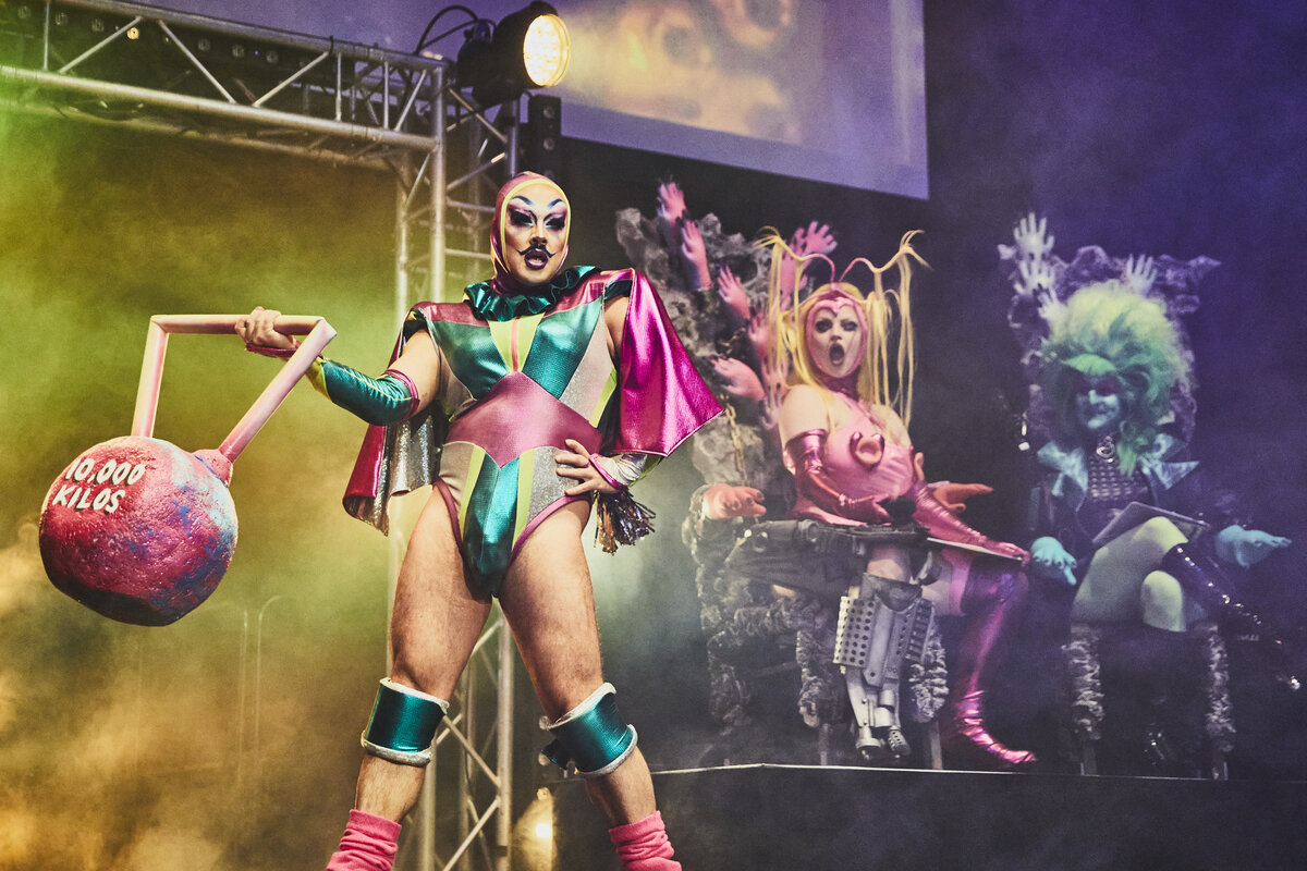 Herzlich willkommen zum „Extreme Drag Wrestling“-Spektakel „Armageddon“! In der Mitte der K6, der größten Hallenbühne des Theaters Kampnagel Hamburg, ist ein sogenannter squared circle, ein Wrestlingring, aufgebaut. Hier wird an diesem Abend der Weltuntergang eingeläutet. Performt wird die Apokalypse von den US-amerikanischen, queeren Drag-Wrestling-Stars der Gruppe Choke Hole: mit dabei Jassy, Visqueen, Gorleenyah, RAID, Jocylene Change, Miss Toto, Otto Von Blotto, Laveau Contraire und Trisha Bing Bong. Unterstützt werden sie von den lokalen Dragqueens Gitte Schmitz als Schiedsrichter*in und Felicia Diamond als Ringgirl sowie den Berliner Dragperformer*innen Gieza Poke, Ivana Dicic, Aurah Jendafaaq und Patry Coal.