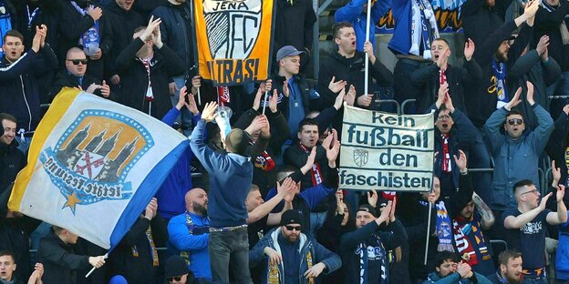 Fans vom FC Carl Zeiss Jena mit korrekter Message im Fanblock: kein fussball den faschisten Foto: Karina Hessland/imago