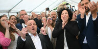 Auf der Wahlparty des BSW in Brandenburg wird kräftig gejubelt: Zweistellig zieht die neue Partei in den Landtag ein Foto: Sebastian Christoph Gollnow/dpa