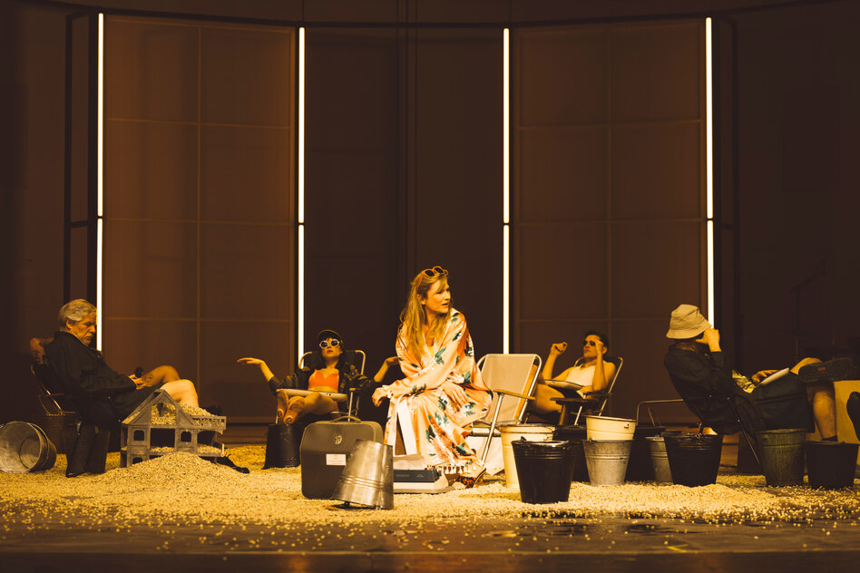 Daniel Wollenzin hat eine Metallskulptur in einen Halbkreis aus Papierwänden gestellt. Sie könnte die Gletscherzunge sein, vor der Siri Carla Brodowsky anfangs vom Entstehen der Endmoränenlandschaft spricht, während das Ensemble Kies schippt und Wassereimer schleppt. Später schwebt das Gebilde wie eine Wolke über der Bühne, während unten die Liegestühle ausgeklappt werden. Zu diesem Setting passt Eisenachs Zugriff aus der Halbdistanz: Die Spieler:innen erzählen den Roman nach, ohne ihn plump zu bebildern, sie sprechen in der dritten Person über Figuren, die sie zugleich in Schlüsselmomenten hochemotional verkörpern.