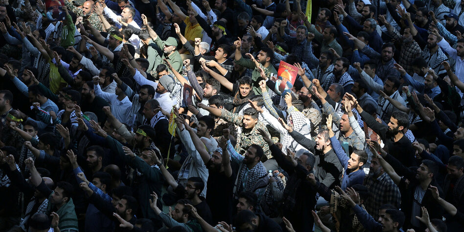 Bei der Gedenkveranstaltung für den Anführer der Hamas, Nasrallah, am 4. Oktober zeigen sich Anhänger kämpferisch Foto: Office of the Iranian Supreme Leader/wana/reuters
