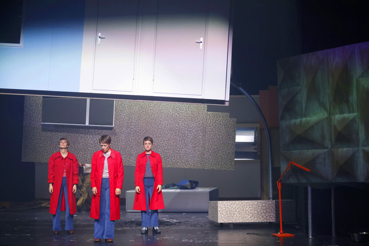 Unverständlich ist, warum Baumgarten sein Ensemble auf Artillerie-Angriffsmodus getrimmt hat. Grimmigen Gesichts tritt schon zu Beginn die dreifache Linkerhand an die Rampe und schleudert ihre Sätze wie Geschosse in die Sitzreihen. Differenzierung bleibt auf der Strecke. Auch das andere Personal – ob Baustellenbelegschaft, Architektenkollegen oder Vorgesetzte der jungen Architektin Linkerhand – schließt sich dem Stakkato-Modus an. Das verzerrt die Figuren zu Klischees.