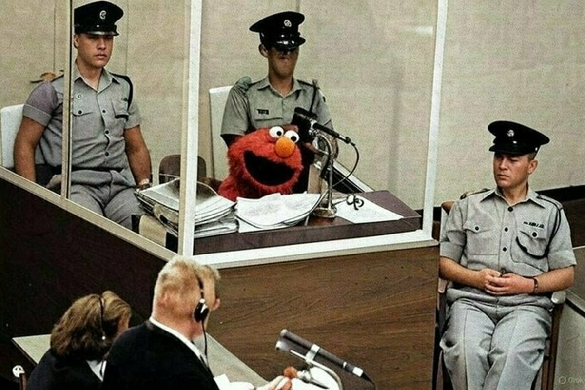 Auf einem anderen Foto steht Elmo vor Gericht in Nürnberg nach dem Zweiten Weltkrieg. „Elmo folgte nur Befehlen“, schreibt jemand dazu.
