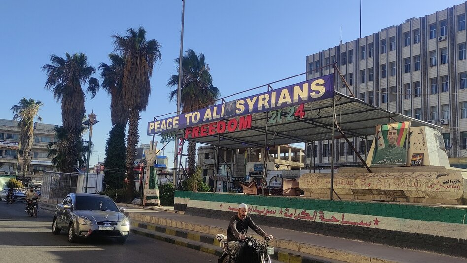 Friede für alle Syrer – Freiheit 2024“ steht in großen Buchstaben auf einem Schild an einem Metallgerüst, bemalt in Grün-Weiß-Schwarz mit roten Sternen, den Farben der syrischen Oppositionsflagge. Daneben die weiße Skulptur einer Hand, die das „Victory“-Zeichen formt. Hier, auf dem Sahat al-Karama, Platz der Würde, in Suweida kommen Menschen seit 2011 zusammen, um für Würde, Frieden und Freiheit zu protestieren.
