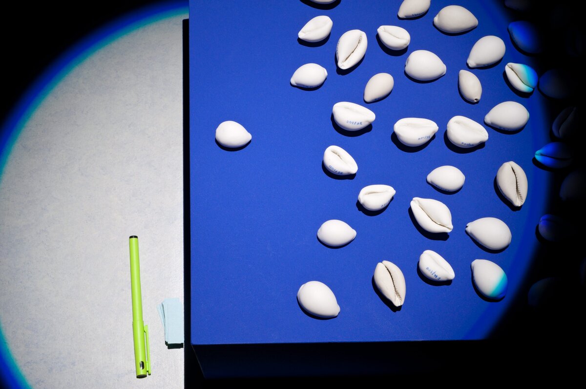 Kaurimuscheln spielen da zum Beispiel eine Rolle, jene Schneckengehäuse, die in der Südsee, in Afrika, Ost- und Südasien über Jahrhunderte hinweg als Zahlungsmittel genutzt wurden. Lehmann hat solche auf einem Tisch in der Mitte des Labyrinths arrangiert und – so viel sei hier schon verraten – echt sind sie nicht. Aber was ist schon echt? Und was hat Echtheit überhaupt noch mit dem Wert eines Objekts zu tun? Bei Lehmanns Muscheln handelt es sich um eine 100-teilige durchnummerierte Kunstedition aus Porzellan. Ihr Wert bestimmt sich also wieder anders – naheliegend, dass Lehmann auch auf die irren Verflechtungen von Finanz- und Kunstwelt anspielt.