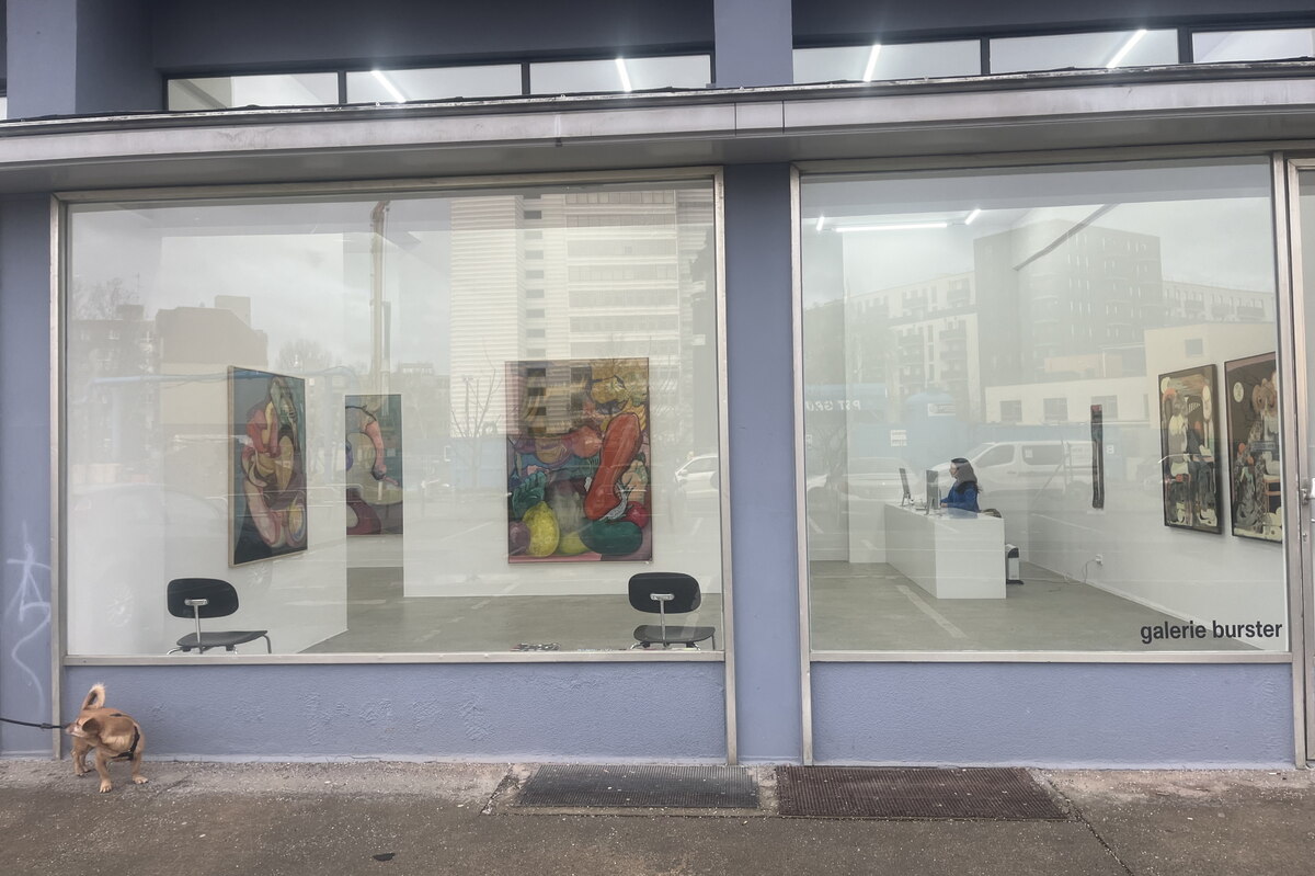 Dann beginnt die Grand Tour. Bei Galerie Burster zeigt Eglé Otto im Dialog mit Alex Feuerstein fenimistisch-surrealistische Großformate. Das an Dalís „Weiche Konstruktion mit gekochten Bohnen“ erinnernde „Fortuna mit Kurkumaschenkel“ ist inspiriert durch die Mutter der Künstlerin, die Ökotrophologin ist, erläutert Kuratorin Joey in ceruleanblauem Pulli: das Chaos der Mutterschaft symbolisiert durch verschallertes Gemüse.