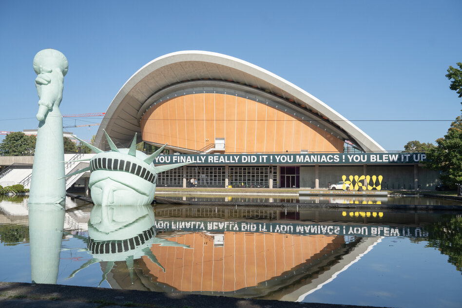 Das erste laute „Oje“ entfährt dem Mund schon in die kühle Morgenluft, bevor man überhaupt nur vom Fahrrad abgestiegen und die Ausstellungsfläche des Berliner Hauses der Kulturen der Welt betreten hat. Da ragt nämlich schlaff nicht nur eine aufblasbare Freiheitsstatue aus dem Wasserbecken vor dem Ausstellungshaus.