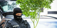 Ein vermummter Polizist trägt beschlagnahmte eine Hanfpflanze mit einem Topf