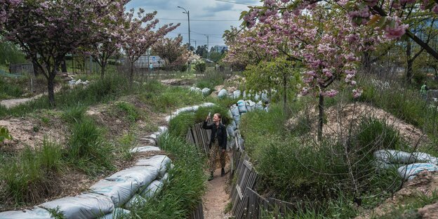 Vielleicht auch zum ersten Mal im Schützengraben: eine Ukrainerin spaziert durch eine Stellung der ukrainischen Armee in Kyjiw Foto: Timothy Fadek/redux/laif