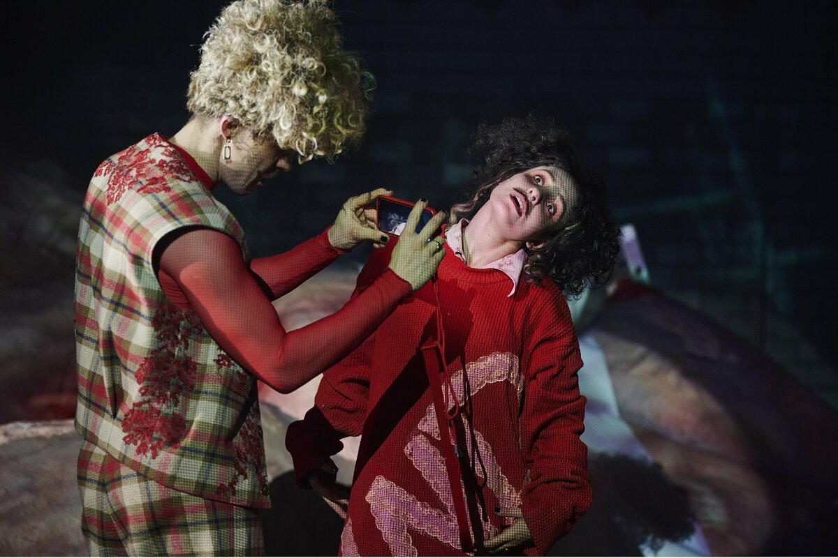 Charlott Lehmann und Paul Sies, die beide die Hauptfigur Kim spielen, tollen auf dieser Landschaft aus Fleisch herum, rutschen über die Brüste, klettern die baum­dicken Oberschenkel hinauf zum Knie, kriechen in die leeren Augenhöhlen, schlüpfen durch rotes Schamhaar.