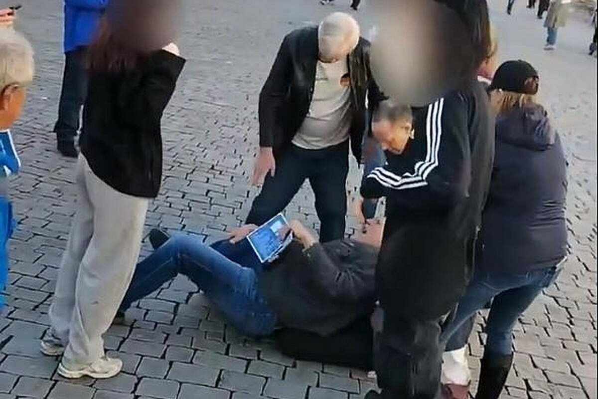 „Ein Schlag von der Seite zwischen die Beine. Ein Sturz vornüber aufs Kopfsteinpflaster. Ein stechender Schmerz im Knie. Fußtritte gegen die Beine und den Oberkörper. Michael Maurer hat vor Schmerzen geschrien – und kann nicht fassen, was er am Samstag (28. Februar) auf dem Max-Josefs-Platz erlebt hat.“
