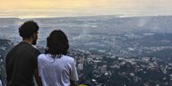 Ein Mann und eine Frau schauen von einem Hügel auf Beirut