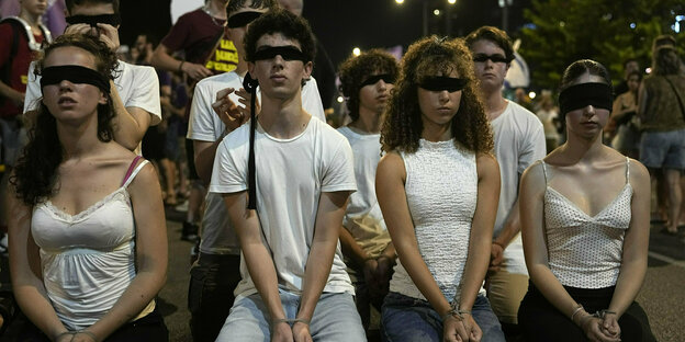 Dem Leid der Geisel nachempfunden: Proteste in Tel Aviv Foto: Tsafrir Abayov/ap/dpa
