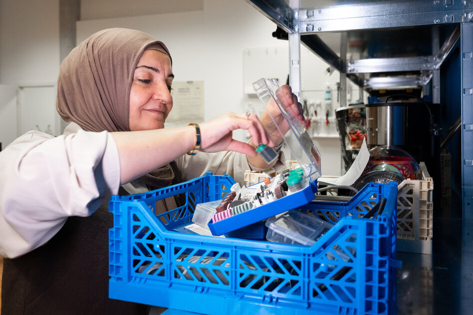 Das beginnt mit der Ansprache. Auf Deutsch, Arabisch und Türkisch ziert der Schriftzug „teilen, treffen, reparieren“ die Glasfront des kleinen Ladens, der im November eröffnete. Er liegt offen einsehbar mitten in einem Einkaufszentrum und damit perfekt, meint Ayşe. „Wir sind genau da, wo die Menschen wohnen, einkaufen oder in die U-Bahn steigen“, sagt sie.