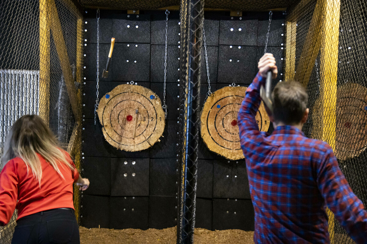 Ich stehe also mit der kleinen Axt in meinen kleinen Händen in diesem Event-Space zum Axtwerfen und soll das Gerät auf eine sehr große nummerierte Zielscheibe werfen. „Wie viele Leute sterben dabei so?“, frage ich die Person, die uns gerade die Wurf-Einweisungen gegeben hat? Eigentlich habe sich noch niemand verletzt, antwortet die. Während ich noch Angst habe, mir selbst oder meiner Axt-Wurf-Partnerin die Axt in den Kopf zu rammen, fange ich einfach schon mal an mit Werfen.