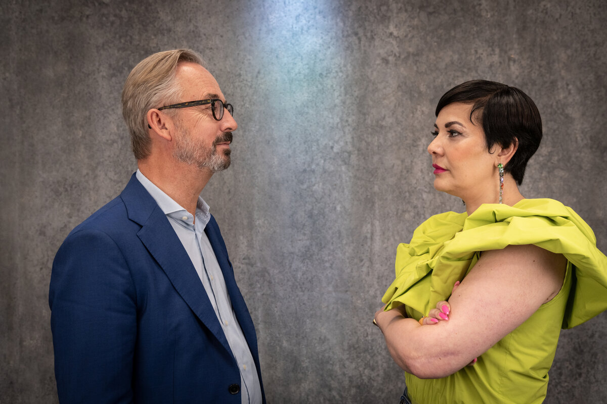 W as für ein rasant geschnittener Trailer, denkt man zunächst. Im raschen Wechsel schreien sich zwei Leute an. Bevor ein Argument vertieft wird: Schnitt. Aus unerfindlichen Gründen hat man sie in viel zu kleine historische Schulpulte gezwängt, wie in so mittelalterliche Folterinstrumente.