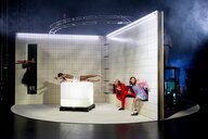 Eng, wie zwischen die Seiten eines Buches gequetscht, sind die einzelnen Kammern, die auf der Drehbühne von Kathrin Frosch an uns vorüberziehen. Durch schmale Schlitze steigen die Figuren vom einen ins nächste Bild, wechseln die Realitäten. In einem Badezimmer wird Mutter-Kind gespielt und die Mutter ist streng und diktatorisch, sonst wäre sie keine. In einer Kammer sitzen Rahel Hutter und Niklas Kraft an Klavieren und untermalen die Szenen melancholisch. Eine Fee taucht auf, zwischen engen Wänden, und erzählt von einem Date, einem sexuellen Akt, von dem sie, die Frau in der Szene, nur hofft, dass er schnell vorübergeht. Die Fee lässt sich irgendwann als Tinkerbell identifizieren, Begleiterin Peter Pans. Ihre Erzählung aber stammt aus den tief pessimistischen Zeilen von Eliots Gedicht.