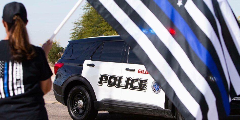 Thin Blue Line: Unterstützer:innen der Polizei in den USA nutzen häufig dieses Symbol Foto: Diannie Chavez/The Republic/imago