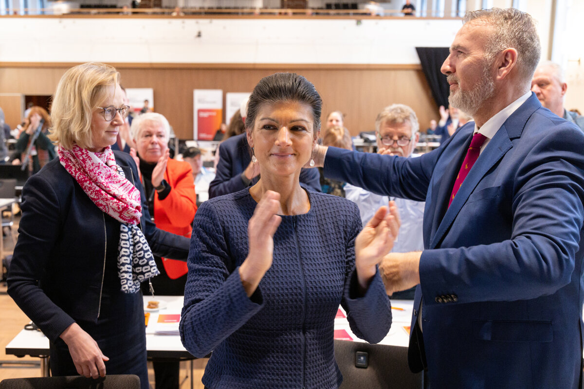 Die Ruhe des Thüringer Waldes schien die geradezu adventliche Eintracht in der Festhalle Ilmenau zu stimulieren. Die Thüringer BSW-Familie mit 126 Mitgliedern – immerhin zweieinhalbmal mehr als in Brandenburg – füllte kaum die Hälfte des Saales. Der gesamte Landesverband passte sogar auf ein Foto mit der angereisten Sahra Wagenknecht.