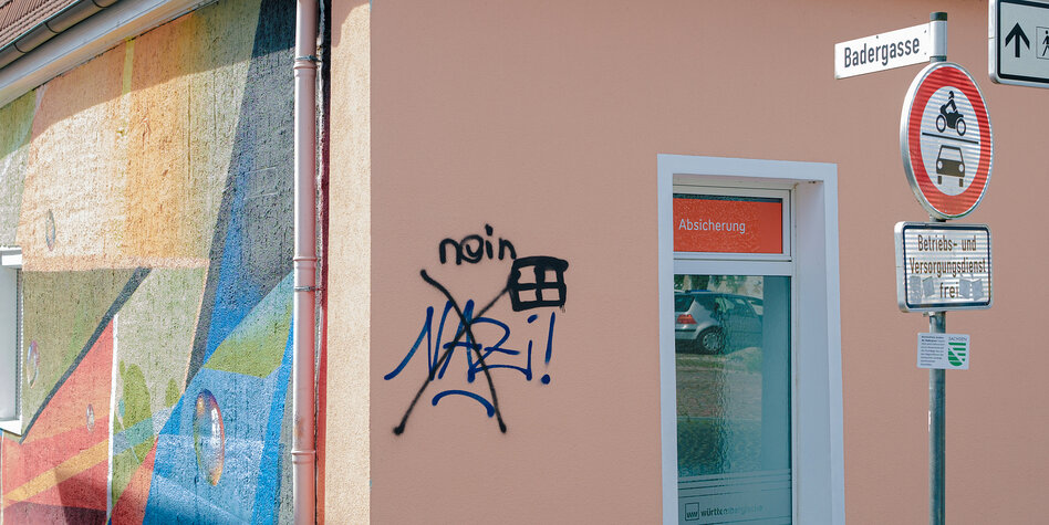 Dem „Frühjahrsputz“ noch nicht zum Opfer gefallen: Graffitis an einer Versicherungsfiliale in Taucha Foto: Leon Joshua Dreischulte