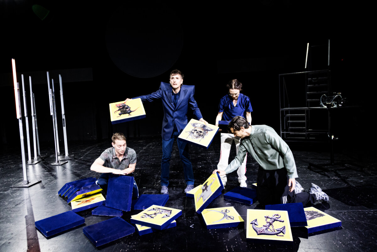 So oder so zieht sich diese Uraufführung. Dynamik entsteht hier und da allein durch ein wenig Komik. Zum Beispiel wenn bei einem Doppelkopfabend die Figur Mo zu sphärischer Musik und in einer Art Raumanzug auftritt. Dadurch will er sich vor einer neuen Fliegenplage schützen. Dass das von ihm mitgebrachte Sprühgift dann noch alle Anwesenden in Halluzinationen versetzt und sie in Zeitlupe dümmlich-beseelt über die Bühne taumeln, hat durchaus Witz. Auch diverse Raps und kleinere Gesangseinlagen tragen noch zur Unterhaltung bei.