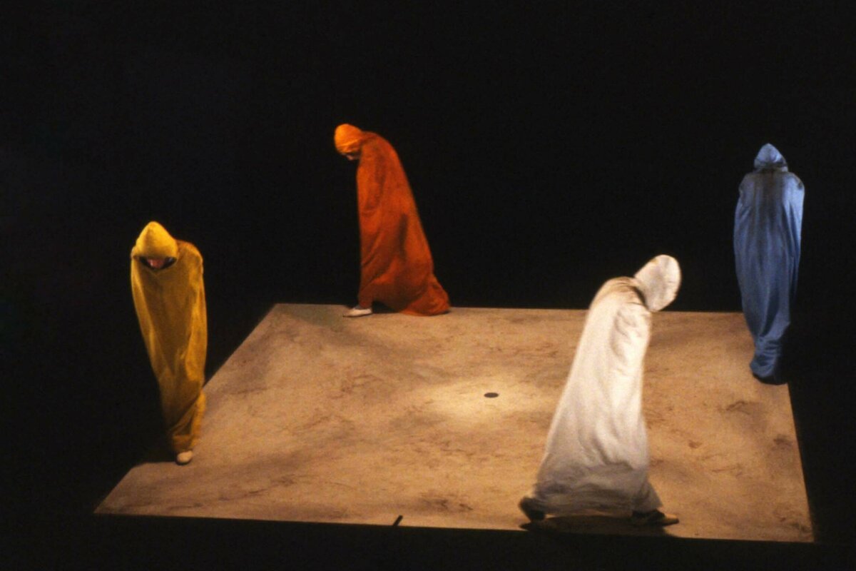 Isolierter könnten sie nicht sein, die vier in verschiedenfarbige Kapuzen­umhänge gehüllten Figuren. Zu sehen sind sie in dem Video „Quadrat 1“ des irischen Schriftstellers Samuel Beckett, das aktuell im Württembergischen Kunstverein gezeigt wird. Nacheinander tauchen sie auf und laufen hektisch die Seiten eines beigen Quadrats ab.