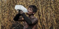 Ein Mann steht in einem Zuckerrohrfeld und trinkt Wasser aus einer Plastikflasche