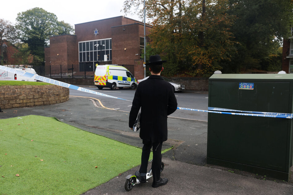 Die orthodoxe Synagoge Heaton Park, ein kastenförmiger Ziegelbau aus den 1960er Jahren, ist abgesperrt. Durch große Fenster sieht man Lampen an der Decke. Die Türen haben kleine Fenster. Hier starben am Donnerstag, an Jom Kippur, dem heiligsten Tag des jüdischen Kalenders, zwei Menschen bei einem Angriff. Der 66-jährige Melvin Cravitz starb vor der Synagoge, als er versuchte, den Angreifer aufzuhalten. Der 53-jährige Adrian Daulby erlag hinter der Tür Fehlschüssen der Polizei.