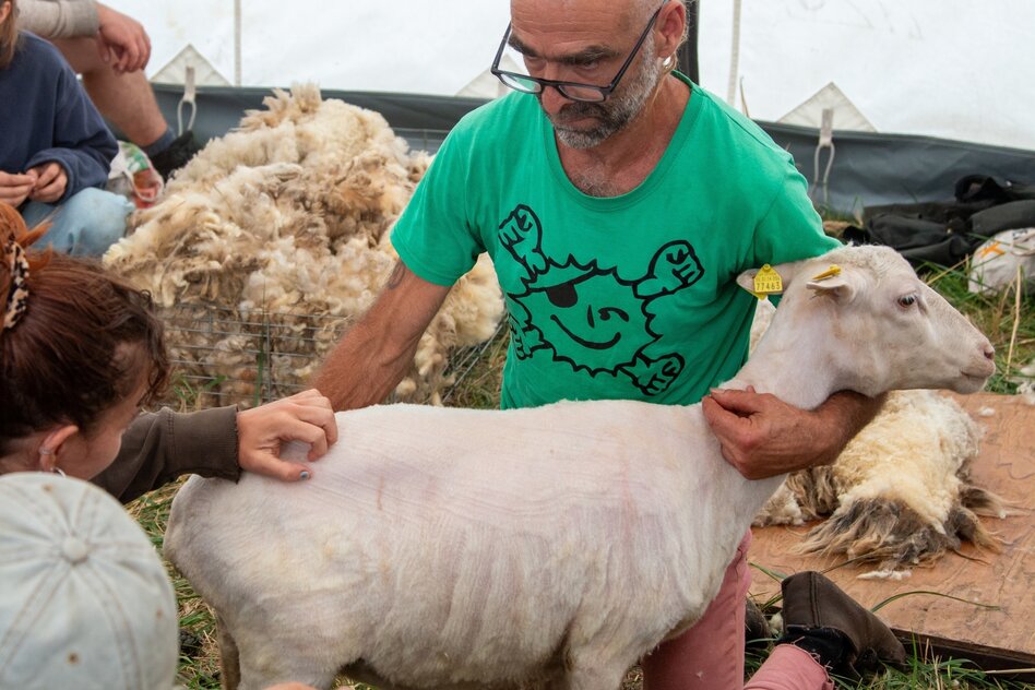 Der Schafschur-Workshop ist eines der praktischeren Angebote. Im Zirkuszelt nebenan tauschen sich gerade Aktivist:innen aus Deutschland, Österreich und Mexiko über das Queer-sein auf dem Lande aus, in einem anderen Armeezelt erarbeiten Teilnehmer:innen Strategien, um sich in Diskussionen mit Rechten auf dem Dorf zu behaupten.