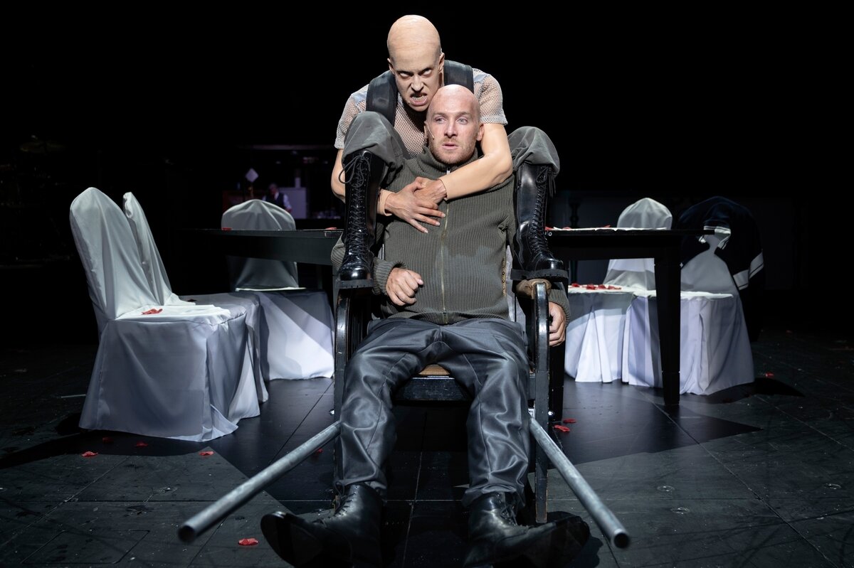 Mit der Parallelführung der Söldnerarmeen von Wallenstein und Prigoschin darf man es allerdings nicht zu genau nehmen. Sie sind verbunden über den wohl bekanntesten Satz im Stück „Der Krieg ernährt den Krieg“, und der hier zum aasigen Businesstypen mutierte kaiserliche Diplomat Questenberg (herrlich: André Benndorff) fragt mal in die Menge: „Warum sollte jemand einen Krieg beenden, dessen maßgeblicher Profiteur er selber ist?“