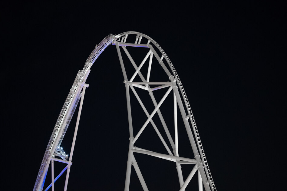Wir schießen auf den höchsten Achterbahnhügel der Welt hinauf. Ich werde noch tiefer als zuvor in den Sitz gedrückt. Es fühlt sich fantastisch an. Alle Widerstände sind aufgegeben, als würde man sich einer Ohnmacht hingeben. Doch kurz vor der tatsächlichen Bewusstlosigkeit, weil ich bei dieser Geschwindigkeit tatsächlich kurzzeitig aufgehört habe zu atmen, hebt mich die abnehmende Steigung etwas aus dem Sitz, am Scheitelpunkt schwinden die wirkenden Kräfte. Alles ist leicht auf dem Gipfel des höchsten Schienenbogens der Welt. Und die Fahrt hält für einen Moment inne.