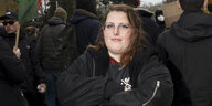 Eine Frau guckt während einer Demonstration selbstbewusst in die Kamera.